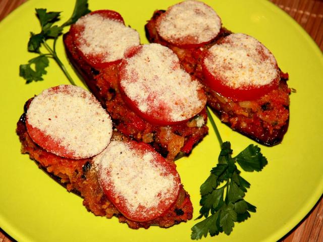 Поверх фаршированных баклажан кладут нарезанные ломтиками помидоры, посыпанные толченым сухарем, и запекают в духовом шкафу.