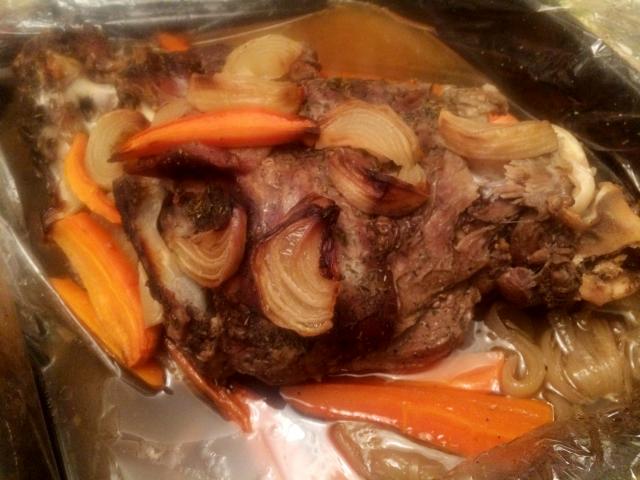 Аккуратно поместить мясо в кулинарный рукав. Вокруг уложить лук и морковь.