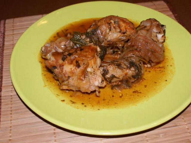 Куриные бедра, голень, по желанию, можно добавить крылья, выкладываем в горячую сковороду и добавляем немного воды. Солим, перчим (чили по желанию), добавляем сахар, сверху кладем крупно нарезанную зелень — кинзу, укроп, петрушку, нарезанный кольцами лук, зубчики чеснока. В небольшом количестве воды разводим томатную пасту и вливаем в готовящееся блюдо. Закрываем крышкой и готовим на маленьком огне до готовности.