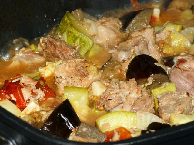 3. Мясо с овощами тушить на медленном огне под крышкой до готовности.