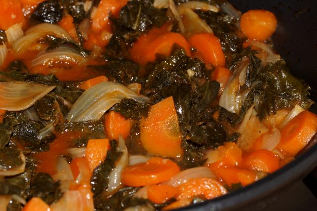 Моркови я взяла 2, и луковицы 2 шт. Листья кале сильно утушиваются и объем уменьшается минимум вдвое от изначального.