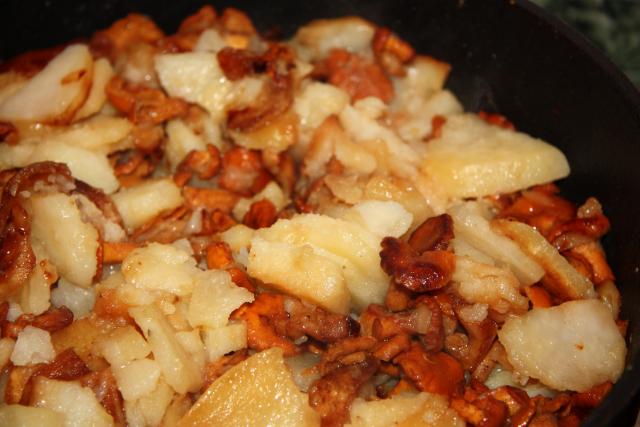 На другой сковороде, посолив, в небольшом количестве растительного масла начинаем жарить картошку. Когда картошка уже жарится, начинаем вливать в нее сок от лисичек. Картошку жарим до полу-готовности.