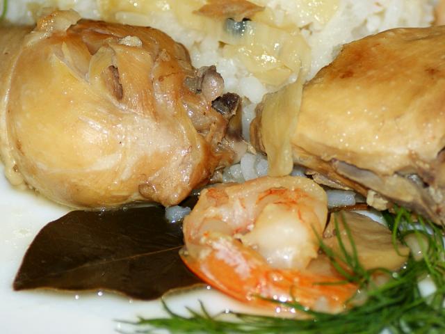 Курица с белыми грибами и креветками