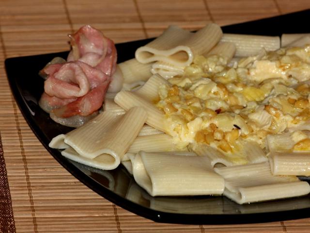 Паккери ригати с соусом из сыра "Бри" и розочками из корейки