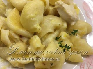Паста с патиссонами, куриной грудкой, сыром Маскарпоне и пряными травами