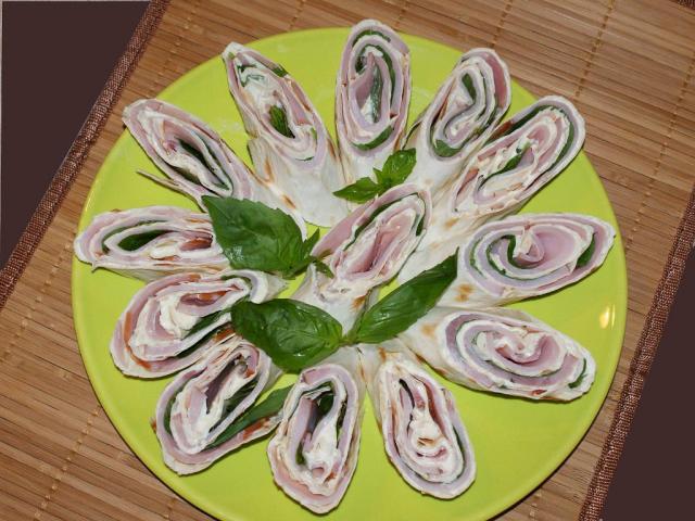 Рулетики с ветчиной, маскарпоне и зеленым базиликом