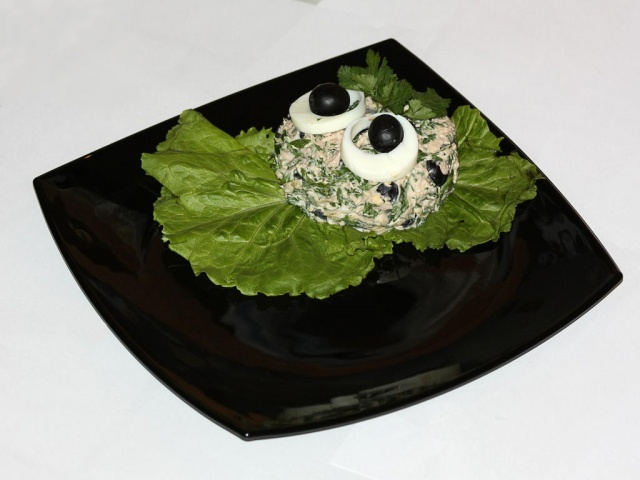 Тунец консервированный в собственной соку перебрать от костей и размять вилкой в салатнице. Маслины разрезать пополам и высыпать в салатницу. Мелко порубить желтки, петрушку. Очистить от кожуры лимон, дольки очистить от пленочек и косточек. Очищенные дольки мелко порезать, и собрав сок, все поместить в салатницу. Раздавить в чесночнице чеснок. Полученную массу заправить майонезом и перемешать.