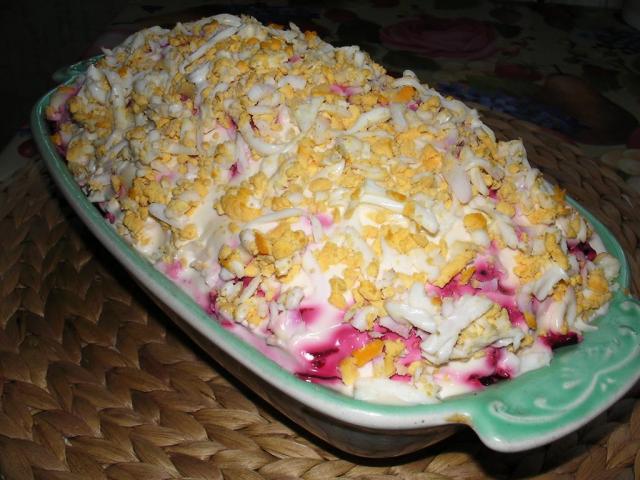Сверху все залить майонезом, разровнять, посыпать натертым вареным яйцом и поставить в холодильник не менее, чем на час. А лучше на ночь. Чтобы салат пропитался.