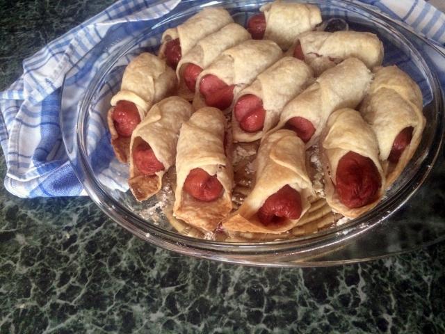Завернуть сосиски в тесто так, как пеленают младенцев, на уголок.