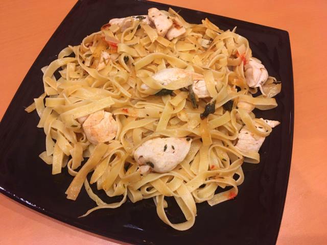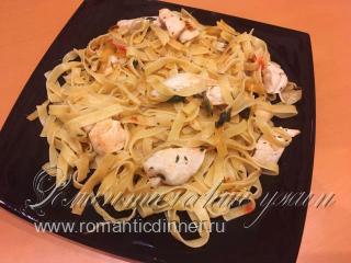 Одновременно в подсоленной воде отварить тальятелле al dente. Слить, перекинуть на сковороду к грудкам.