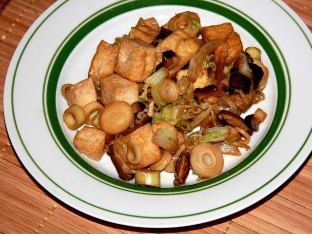 В предварительно нагретом воке или глубокой сковородке нагрейте 1 ст.л. масла, добавьте туда грибы, пекинскую капусту и помешивайте. Добавьте тофу и бамбуковые ростки с устричным и соевым соусом, прогрейте и подавайте.