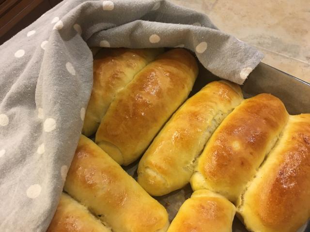 Каждый шарик размять в прямоугольник, смазать их сливочным маслом или уложить начинку, скатать в трубочку, залепить каждую, уложить на противень, накрыть пакетом и оставить на 15 минут.