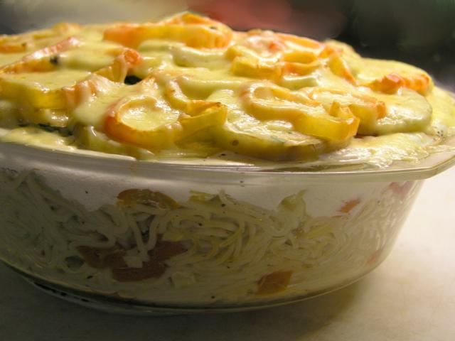 Запеканка из спагетти с овощами, творогом и сыром