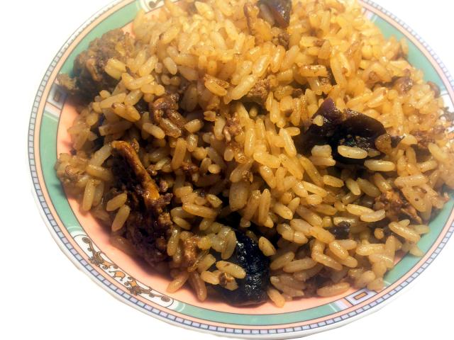 5. Помешивая жарить на сильном огне минут пять. Если рис сухой и несоленый, добавить по вкусу соевый соус.