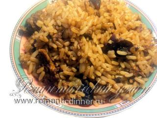 4. Переложить в сковороду рис и кусочки грибов.